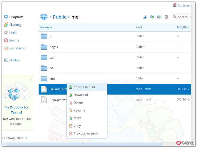 示範的這個上傳步驟我個人將這個 FlashPageFlip軟體中原有的 Free Version資料夾名稱改成了mei,然後整個資料夾一起上傳到Dropbox空間的 Public 夾內。