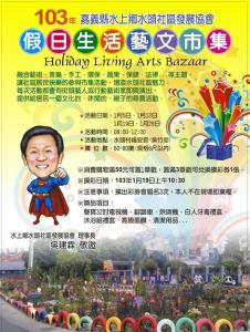 水上鄉"假日生活藝文市集"不同於一般菜市場或夜市,活動內容除了大眾化的食、衣、娛樂、愛心、環保...,還提供了臨時工作機會、法律諮詢、健康衛教。 水頭社區感謝:親民愛民的王鄉長給水上人假日有個藝文地方聚會。 水上鄉親:您是否和我一樣期待水上鄉的"假日生活藝文市集"勝過民雄鄉鵝肉節、鹿草鄉西瓜節、番路鄉柿子節、中埔鄉...呢? 水上鄉親啊,給王鄉長近8年的用心付出,一個熱烈的掌聲吧。 朋友啊~人生其實沒多長,更慘的是,沒人知道自己有多久,有想做的事,就去吧;我們的人生中,能用得上的時間特別少。 所以,我們應該把握當下,不要虛耗時光,人活了一輩子,至少要做一件讓自己感覺"有意義"的事。 "感動"就一定會改變,請您和我一起做別人生命中的貴人。 水上鄉水頭社區發展協會 理事長吳建霖 敬邀
